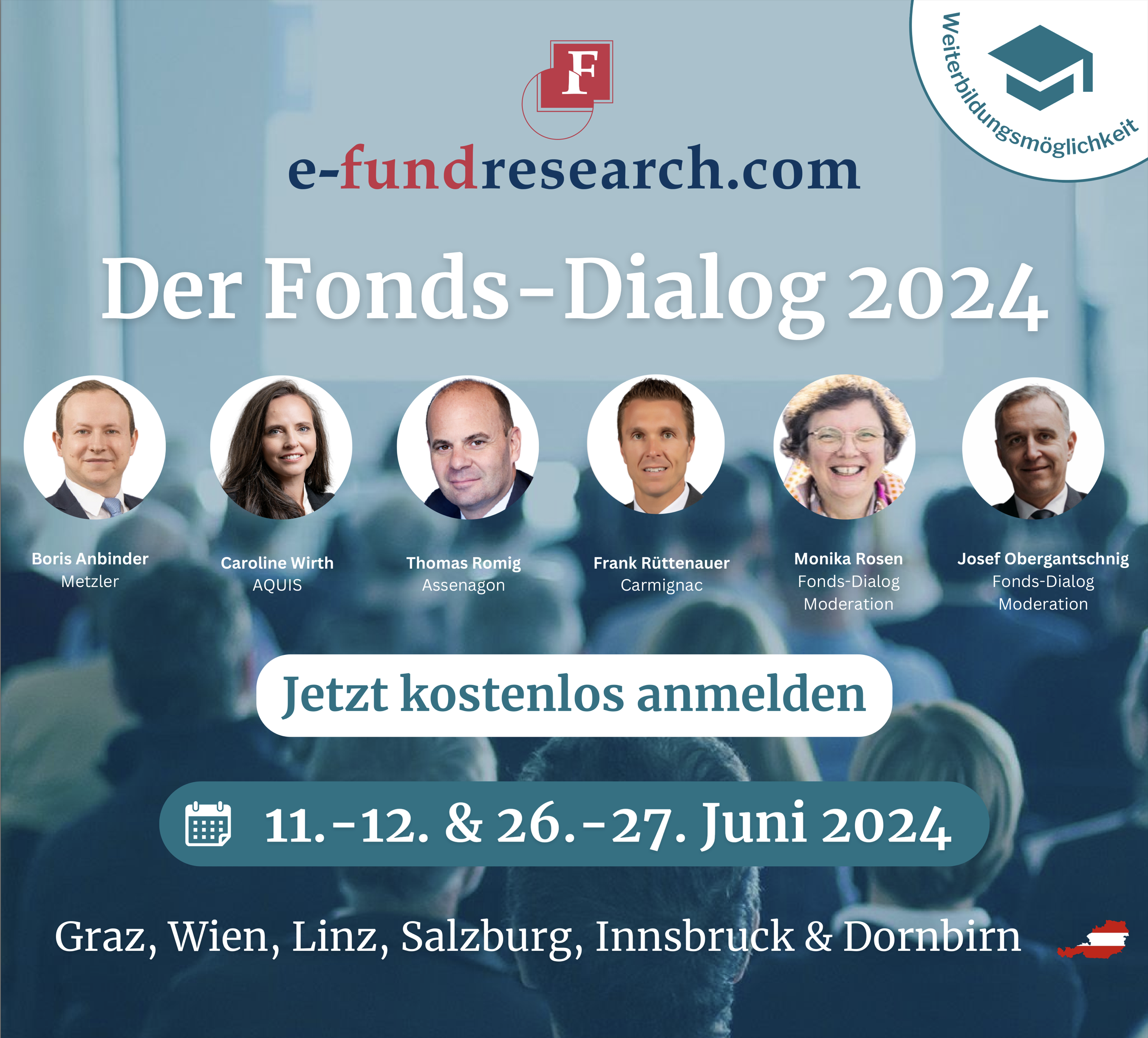 Es freut mich, gemeinsam mit e-fundresearch.com wieder auf Österreich-Tournee zu gehen. Für mich persönlich ist das immer auch die Gelegenheit, interessante Persönlichkeiten zu treffen und mich mich mit Expertinnen über brandaktuelle Themen auszutauschen.