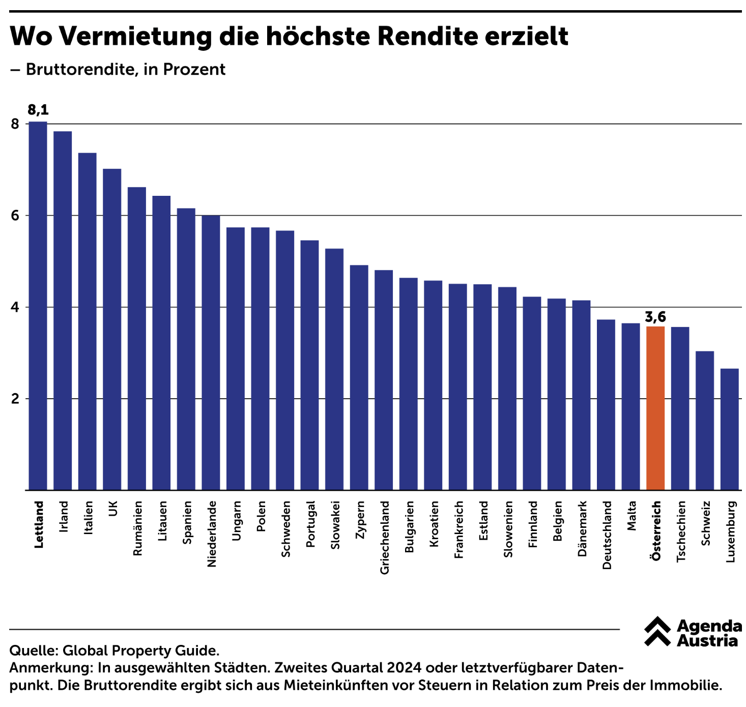 In Österreich liegt die durchschnittliche Bruttorendite bei 3,6%. Instandhaltung, Steuern, Bewirtschaftung, mangelnde Zahlungsmoral des Mieters und ein etwaiger Leerstand sind hier noch nicht berücksichtigt.