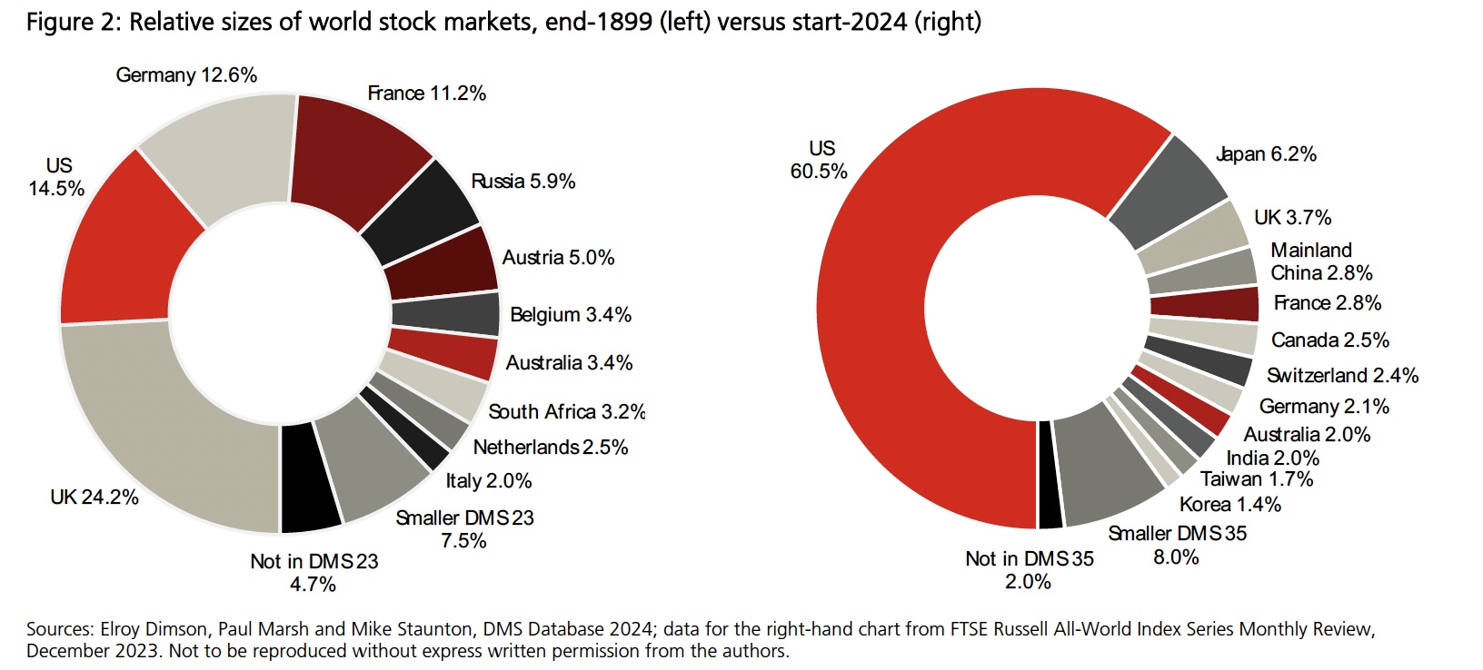 Interessanter Vergleich der Ländergewichtungen im Welt-Aktienmarkt: 1899 machten US-Aktien lediglich 14,6% aus – im Jahr 2024 sind es bereits 60,5%.