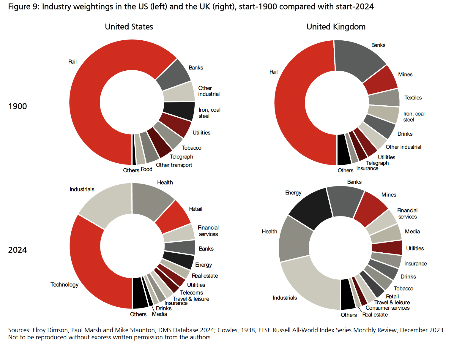 Interessant ist, dass in Europa, insbesondere im ehemals dominierenden Aktienmarkt des Vereinigten Königreichs , Technologie kaum eine Rolle spielt. Hier sind vor allem die Sektoren Industrie, Gesundheit, Energie und Banken führend.