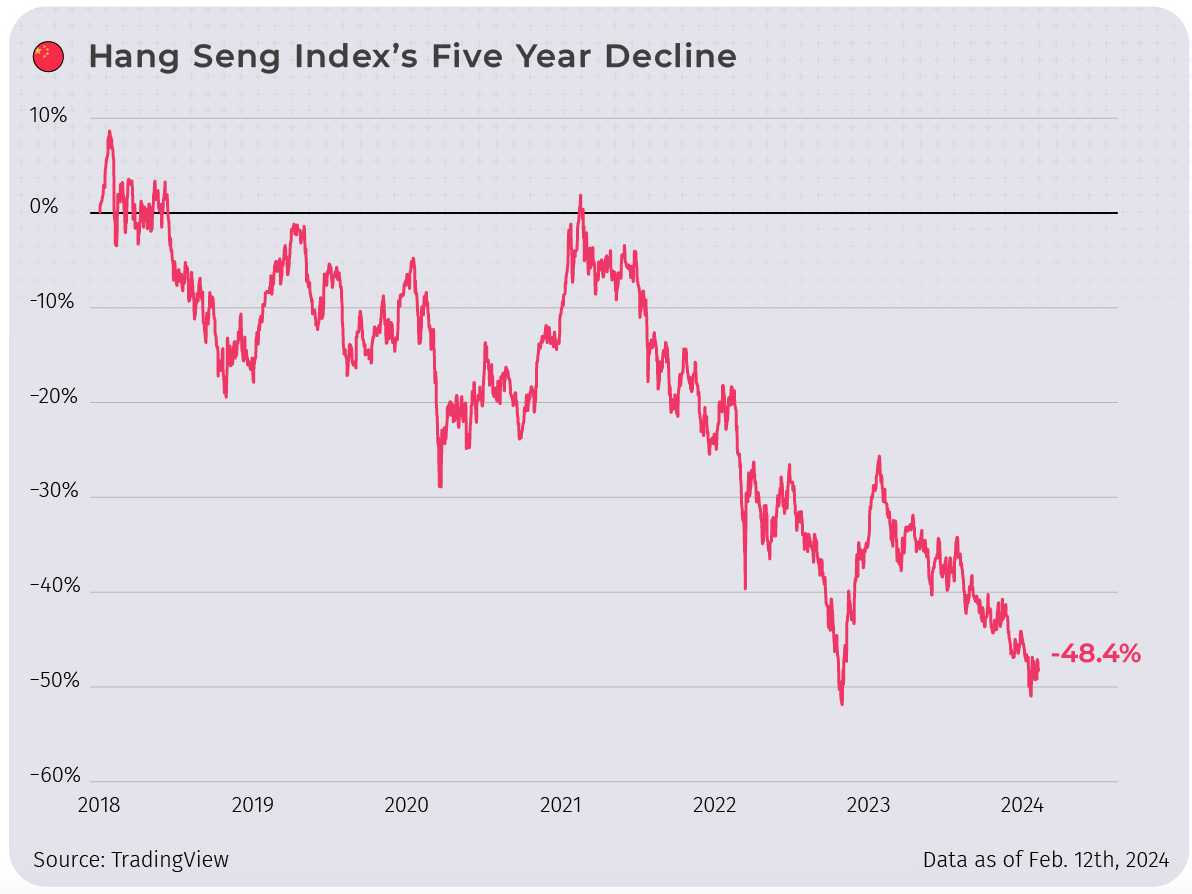 In den letzten 5 Jahren hat der Hang Seng Index, der Leitindex der Börse von Hongkong, der die größten und liquidesten Unternehmen abbildet, nahezu 50% seines Werts verloren. Trotz dieser Herausforderungen bleibt China ein Wachstumsgigant. Das rasante Wirtschaftswachstum des Landes hat allerdings nicht automatisch zu steigenden lokalen Aktienkursen geführt.
