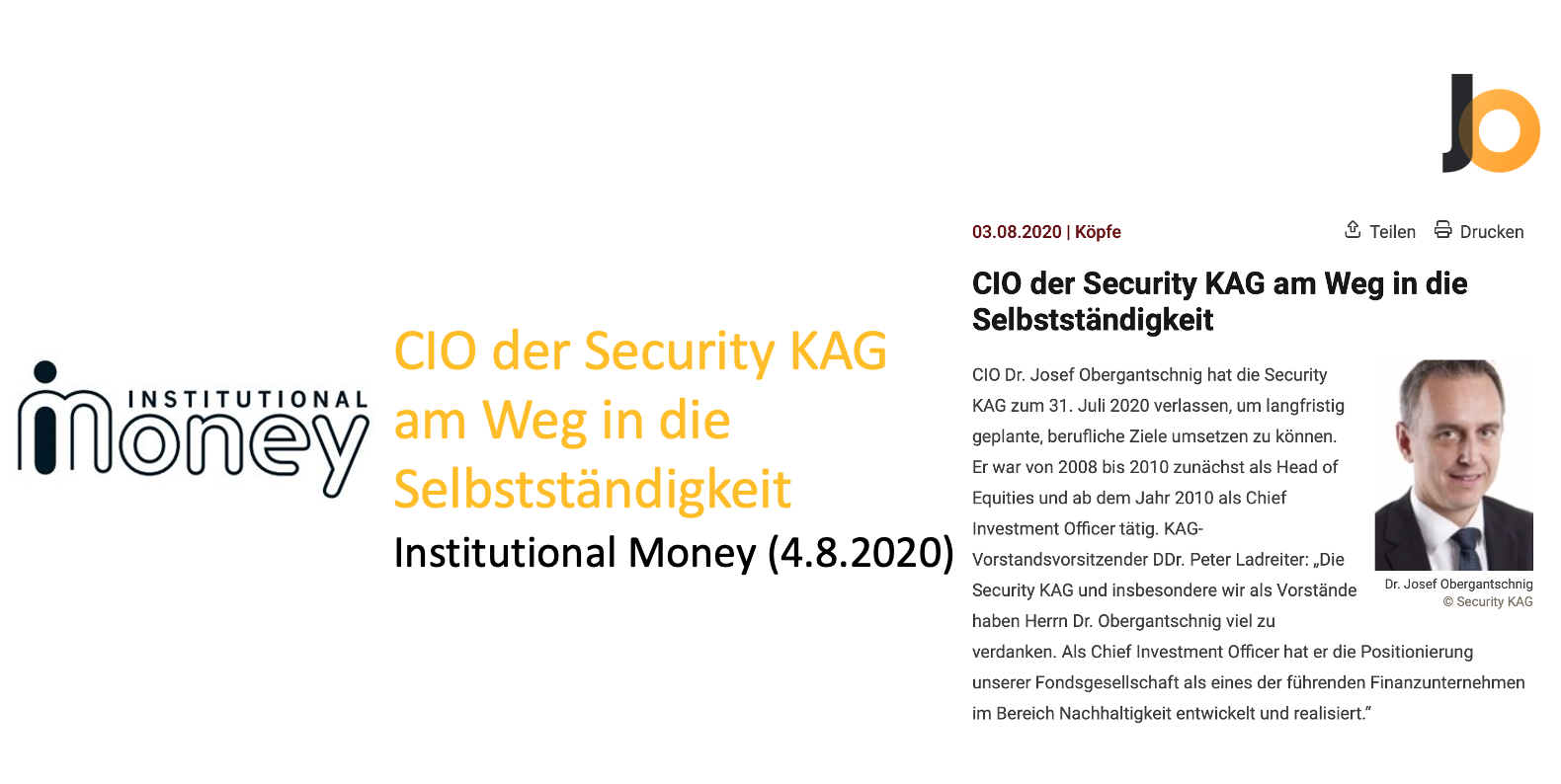 CIO Dr. Josef Obergantschnig hat die Security KAG zum 31. Juli 2020 verlassen, um langfristig geplante, berufliche Ziele umsetzen zu können. Er war von 2008 bis 2010 zunächst als Head of Equities und ab dem Jahr 2010 als Chief Investment Officer tätig. KAG-Vorstandsvorsitzender DDr. Peter Ladreiter: „Die Security KAG und insbesondere wir als Vorstände haben Herrn Dr. Obergantschnig viel zu verdanken. Als Chief Investment Officer hat er die Positionierung unserer Fondsgesellschaft als eines der führenden Finanzunternehmen im Bereich Nachhaltigkeit entwickelt und realisiert.“