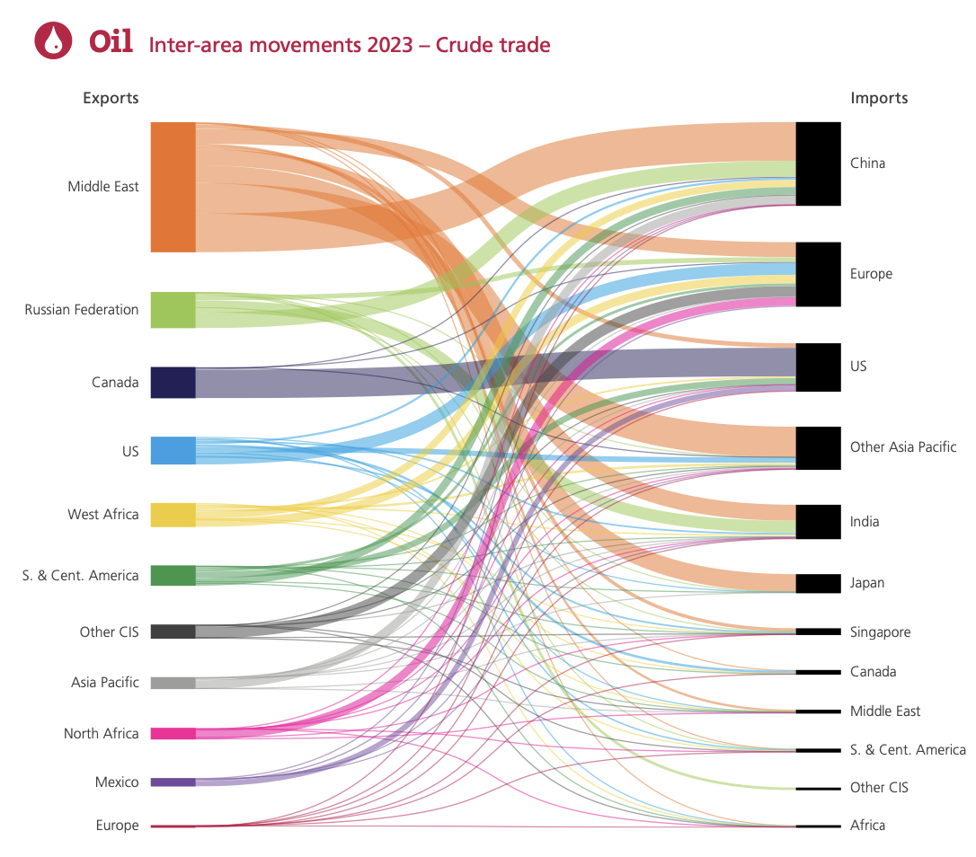 Im vergangenen Jahr wurden 2,1 Milliarden Tonnen Rohöl gehandelt. 41 % der Exporte stammen aus dem Nahen Osten. Obwohl Russlands Volumen aufgrund des Russland-Ukraine-Konflikts zurückgegangen ist, ist es mit einem Anteil von 11 % immer noch das zweitwichtigste Exportland!
