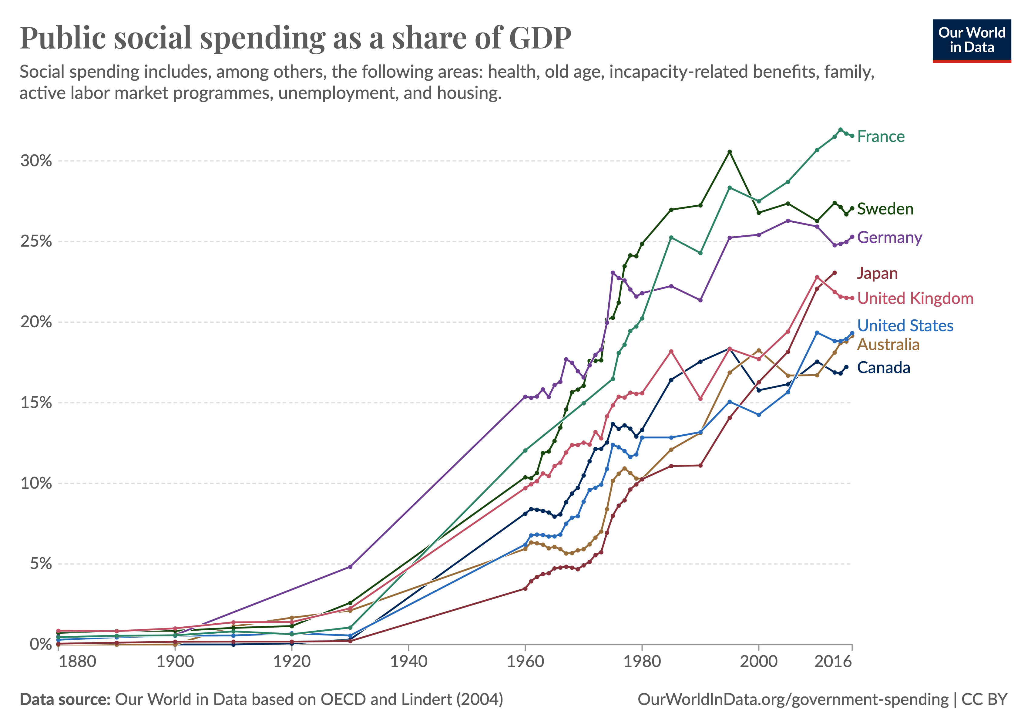 Im 20. Jahrhundert ist nicht nur der Wohlstand gestiegen, sondern auch die Sozialausgaben haben sich deutlich erhöht. Während viele Länder vor etwas mehr als einem Jahrhundert „nur“ 1 % bis 2 % des BIP dafür aufwendeten, ist diese Quote in nahezu allen Ländern deutlich angestiegen. Hauptgründe für diesen Anstieg sind höhere Ausgaben für Gesundheit und Bildung.