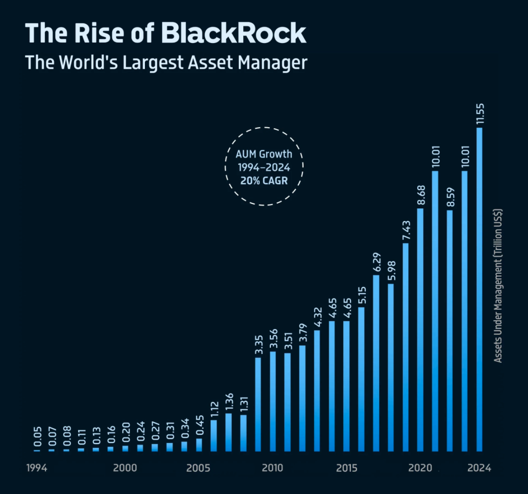 Mit beeindruckenden 11,55 Billionen US-Dollar verwaltetem Vermögen (AUM) im Jahr 2024 dominiert BlackRock die Finanzwelt. Doch wie hat es das Unternehmen geschafft, in drei Jahrzehnten das verwaltete Vermögen von 5 Millionen auf 11,5 Billionen zu erhöhen?