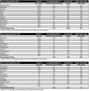 Wir haben die größten Exporteure fossiler Brennstoffe auf Korruption, Pressefreiheit und Kriegsgefahren/Unruhen untersucht. Mit wenigen Ausnahmen, deren Exporte in der chemischen Industrie und ein paar kleineren Nischenbereichen weiterhin benötigt werden, sind die mit Petro-Dollar gesponserten Länder und deren Regierungen aus nachhaltiger Sicht eine regelrechte Katastrophe.