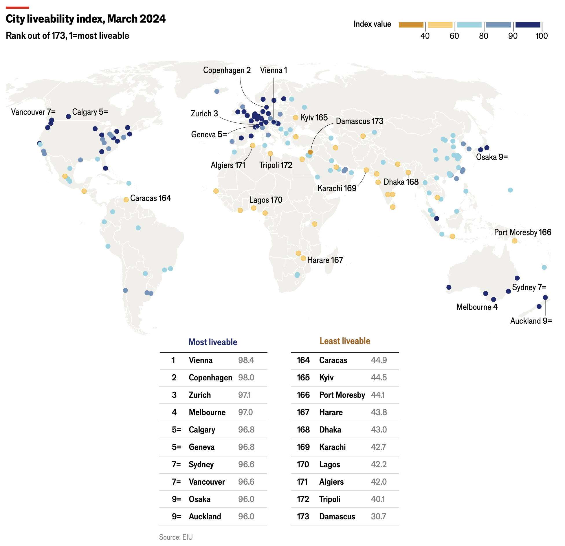 Jährlich ermittelt der britische Economist die lebenswerteste Stadt der Welt. Dabei werden folgende fünf Kategorien berücksichtigt: