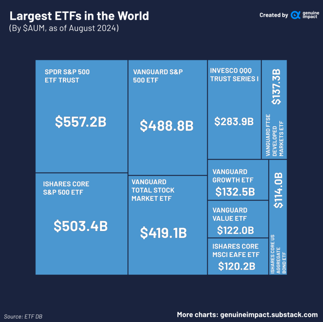 Der weltweit größte ETF ist der SPDR S&P 500 ETF mit einem verwalteten Volumen von 557 Milliarden US-Dollar. Ziel des ETFs ist es, den amerikanischen S&P 500 kostengünstig nachzubilden. Die Top-3 ETFs nach Fondsvolumen beziehen sich alle auf den S&P 500.