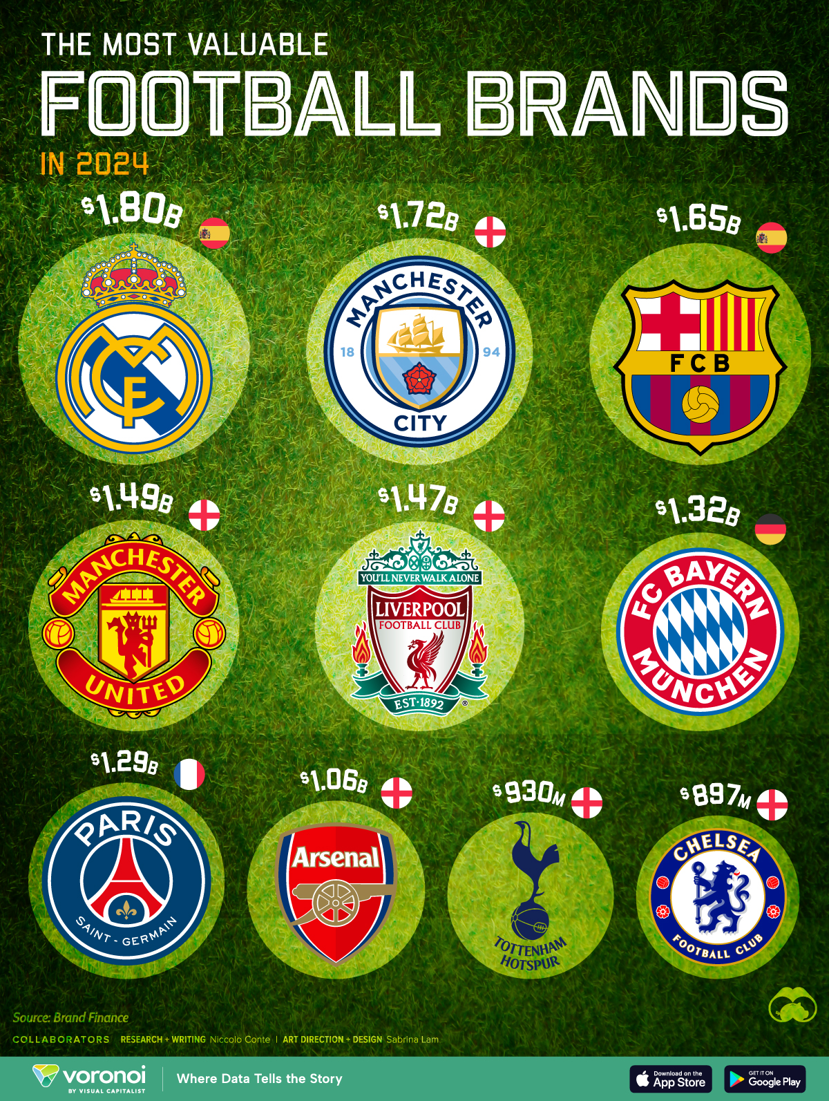 Real Madrid führt die Liste der wertvollsten Fußballmarken 2024 mit einem beeindruckenden Markenwert von 1,80 Mrd. USD an, gefolgt von Manchester City mit 1,72 Mrd. USD und dem FC Barcelona mit 1,65 Mrd. USD.