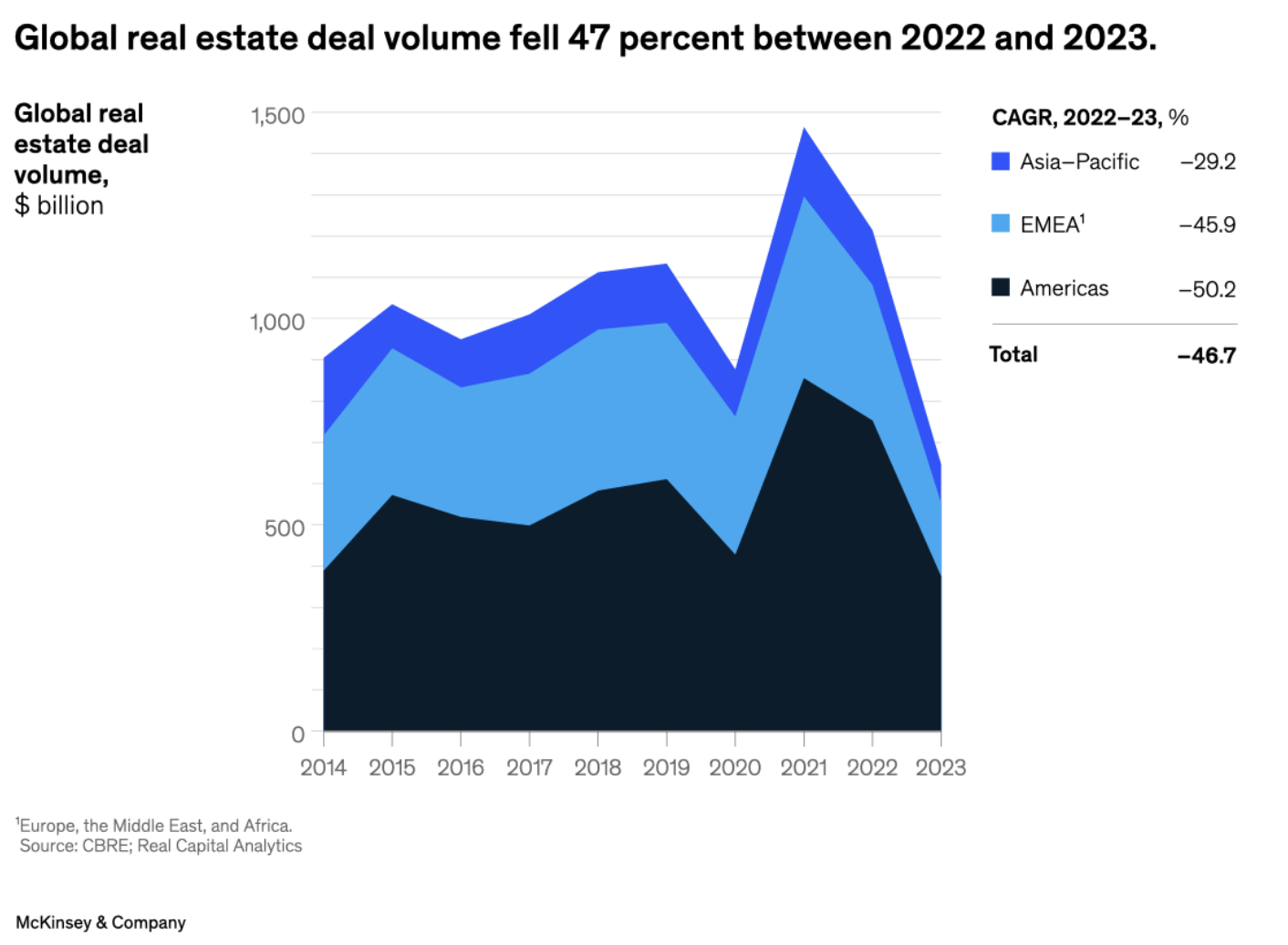 2023 ist das Volumen globaler Immobilien-Deals um 47% zurückgegangen. Der Immobilienmarkt steht definitiv unter Druck.