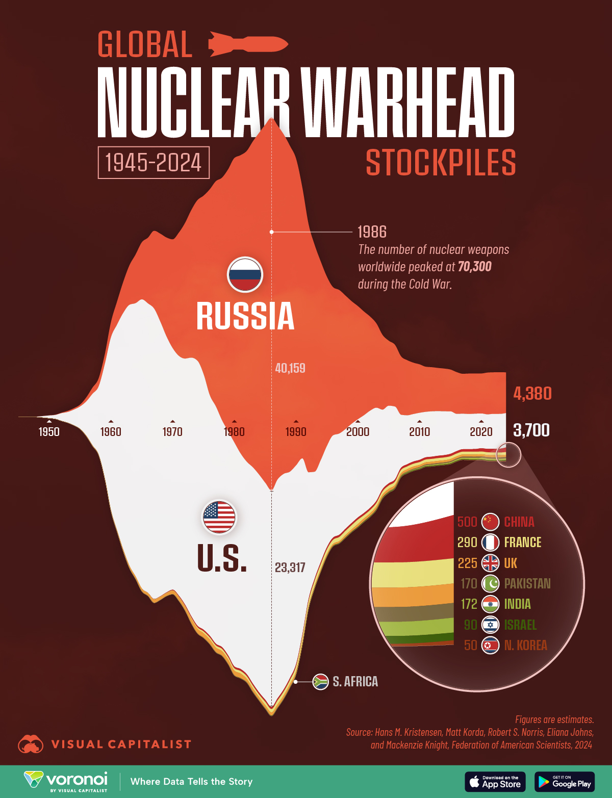 Die Welt ist heute sicherer als während des Kalten Krieges – zumindest was die Anzahl an Nuklearwaffen betrifft. Doch die aktuellen Zahlen zeigen, dass die Gefahr keineswegs gebannt ist.