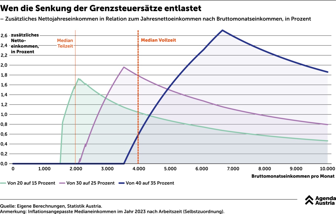 Wenn die Regierung Akzente in Richtung Vollzeitbeschäftigung setzen will, macht es wohl mehr Sinn, erst bei der dritten oder vierten Tarifstufe den Steuersatz zu senken. Laut Agenda Austria würde eine Senkung der dritten Steuerstufe von 30 % auf 25 % 4,1 Millionen Steuerzahlern um durchschnittlich 490 Euro pro Jahr entlasten.