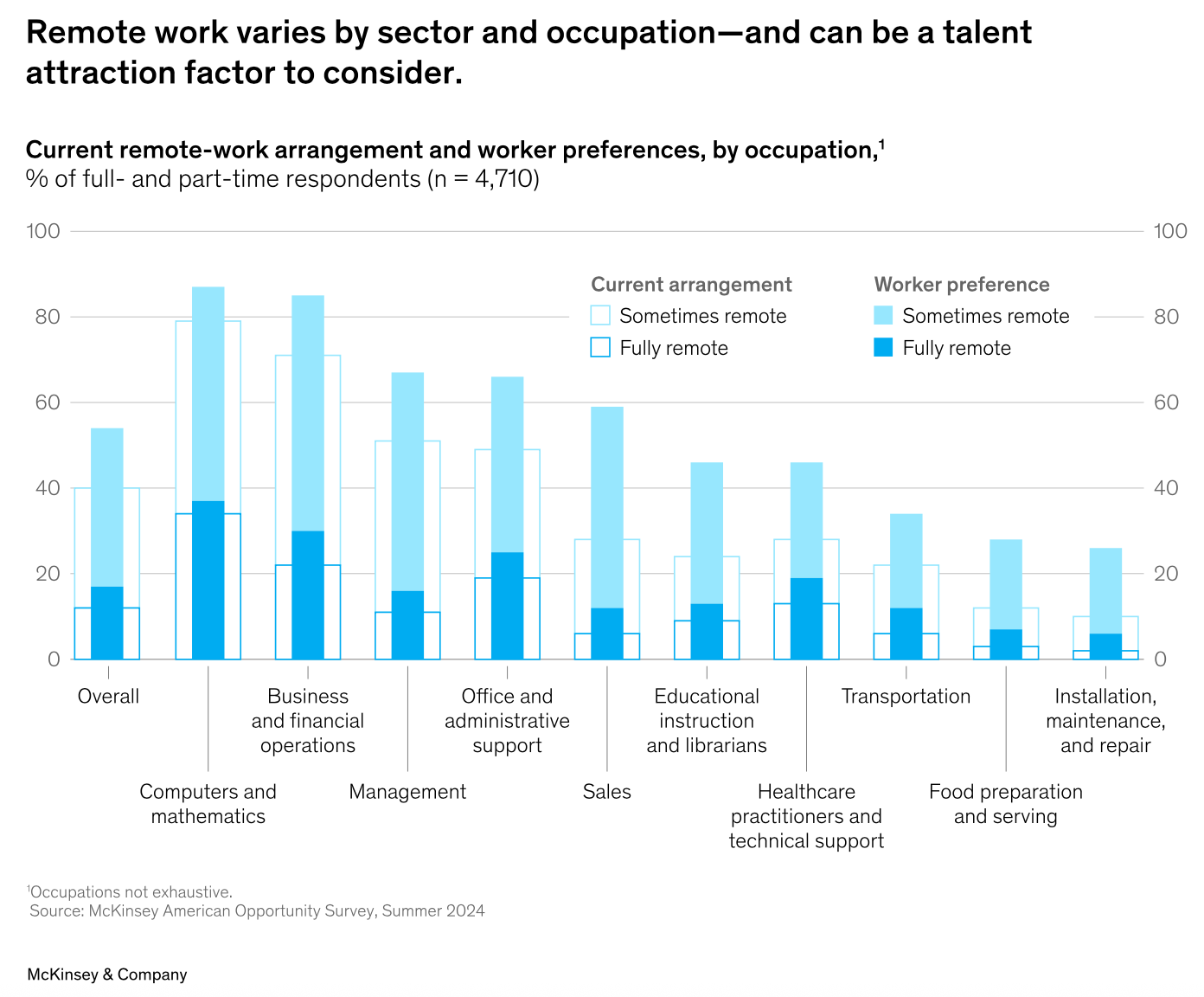 Die Grafik zeigt aktuelle Homeoffice-Modelle und die Präferenzen der Beschäftigten in den USA (McKinsey, 2024):