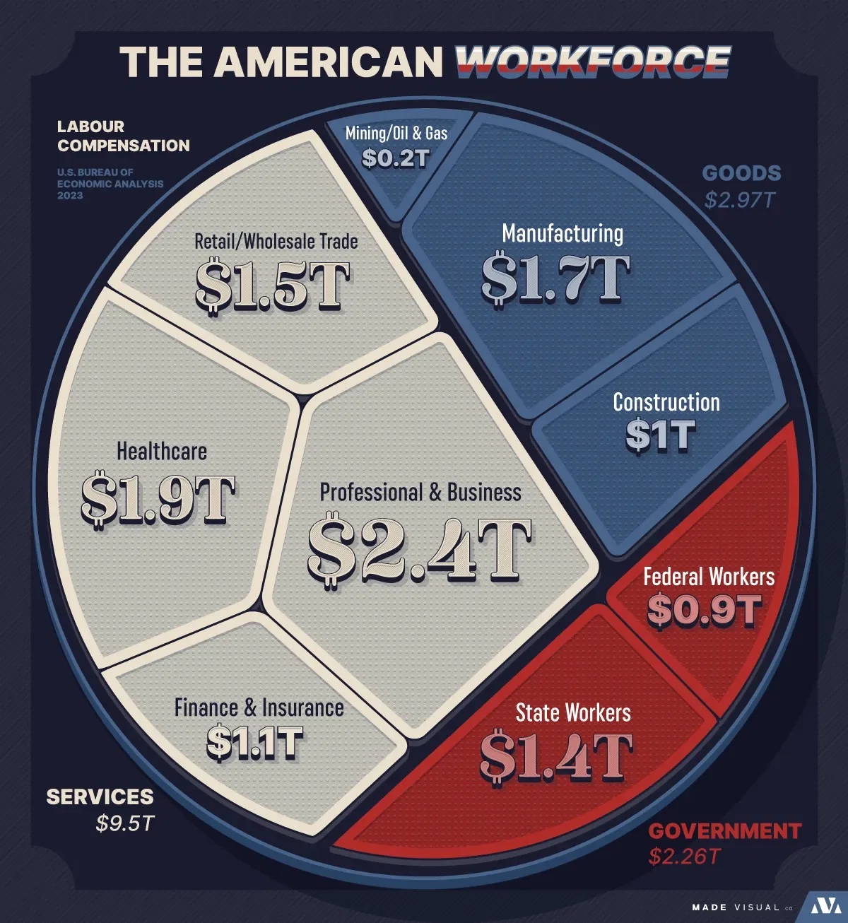 - Manufacturing: Gesamtentgelt von $1,7 Billionen bei 12,6 Millionen Beschäftigten, durchschnittlich $135.000pro Jahr.