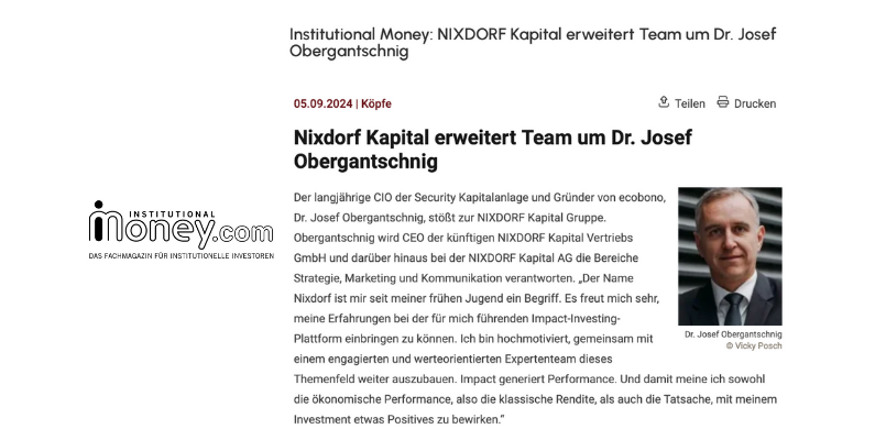 Institutional Money: NIXDORF Kapital erweitert Team um Dr. Josef Obergantschnig