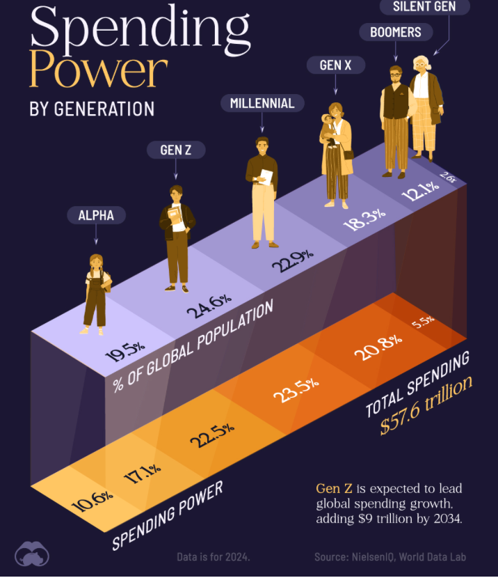 Konsumenten geben weltweit 57,6 Billionen US-Dollar aus. Im Jahr 2034 wird die Gen Z die Millenials das Ausgabe-Ranking der Generationen vor den Millenials anführen.