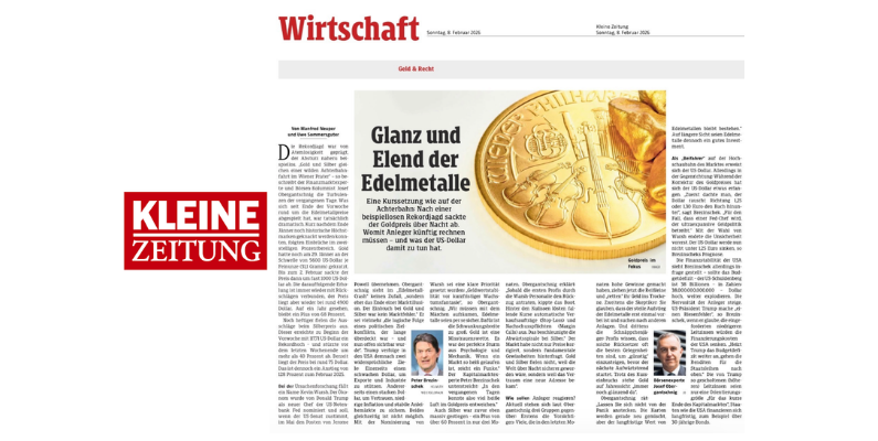In der Ausgabe vom 8. Februar 2026 analysiere ich in der Kleinen Zeitung die jüngsten Turbulenzen bei Gold und Silber – nach einer Rekordjagd folgte ein abrupter Kurseinbruch.