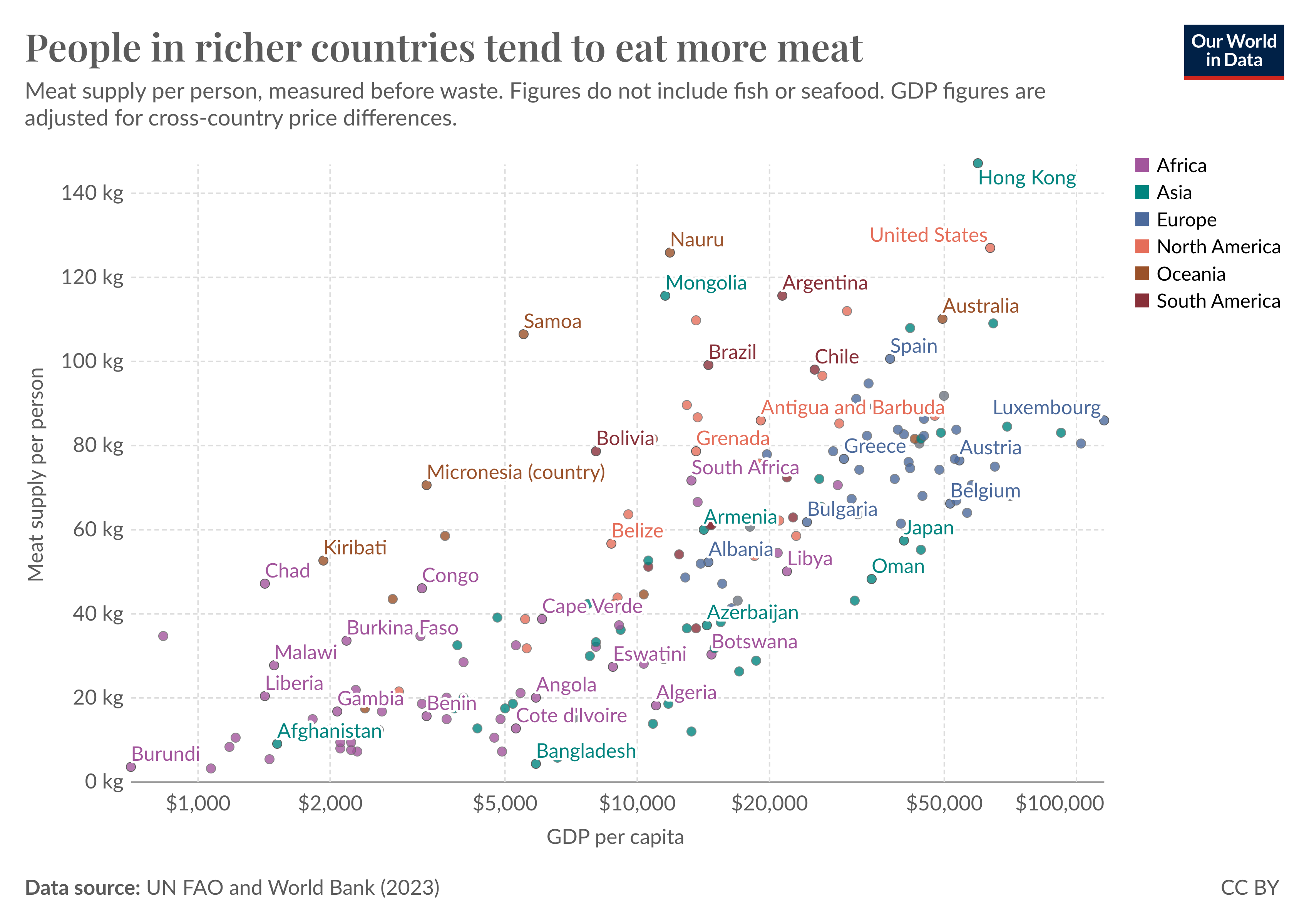 Das Chart der UN zeigt einen klaren Zusammenhang zwischen Fleischversorgung und Bruttoinlandsprodukt (BIP) pro Person: