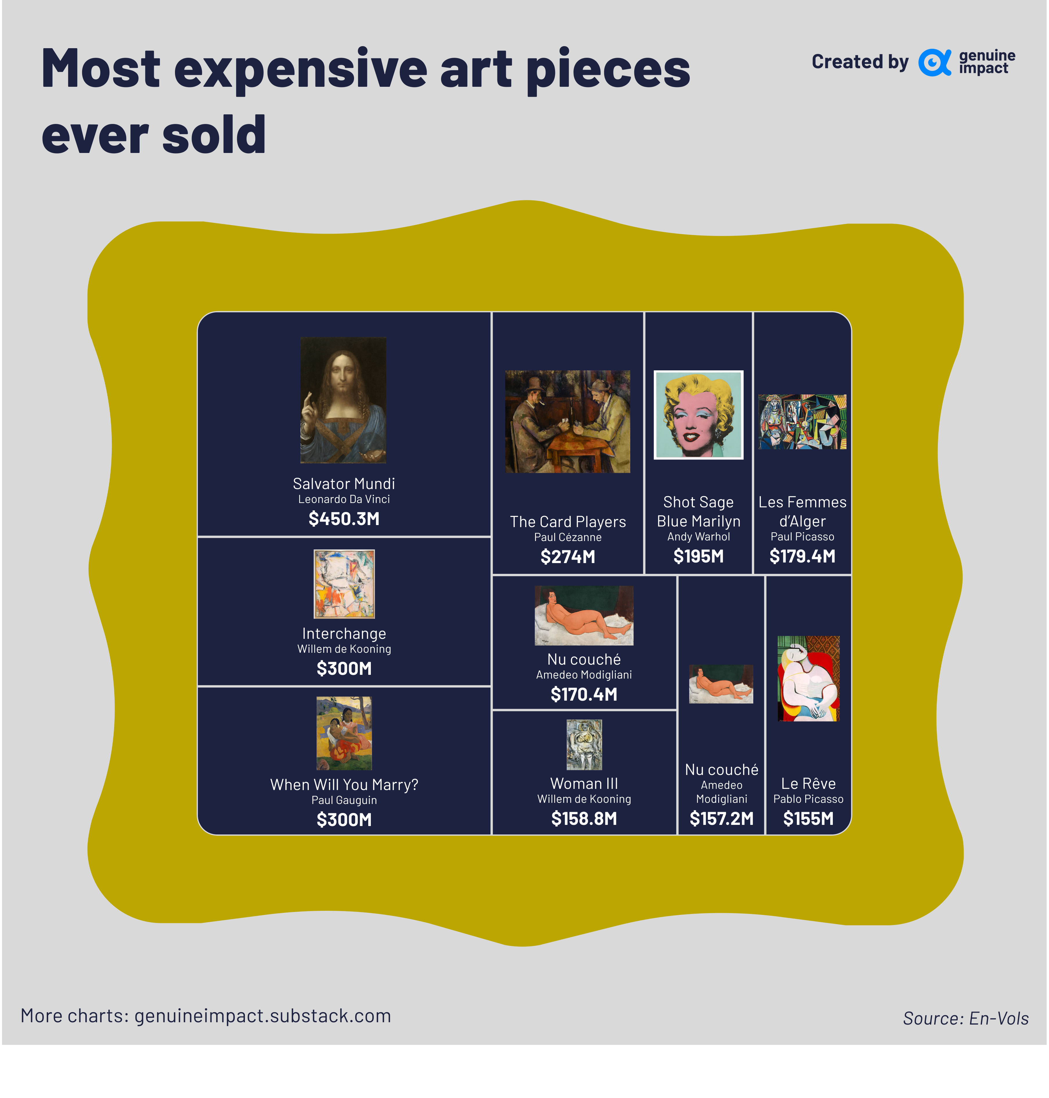 Für die gefragtesten Bilder muss man aber sehr tief in die Tasche greifen. Anbei ein Ranking der teuersten Bilder nach dem Verkaufspreis: