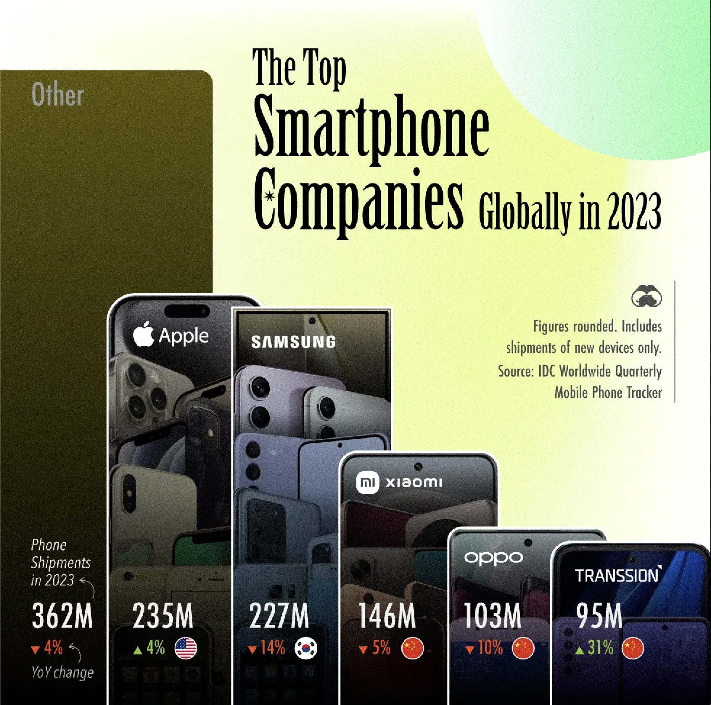 Auf dem fünften Platz befindet sich Transsion, ein Unternehmen, das im Westen noch relativ unbekannt ist. Die in Shenzhen ansässige Firma gewinnt jedoch schnell an Bedeutung in aufstrebenden Märkten wie Afrika, Lateinamerika und Südasien. Transsion konnte seinen Anteil am globalen Smartphone-Markt im Vergleich zu 2022 um beeindruckende 30,8% steigern.