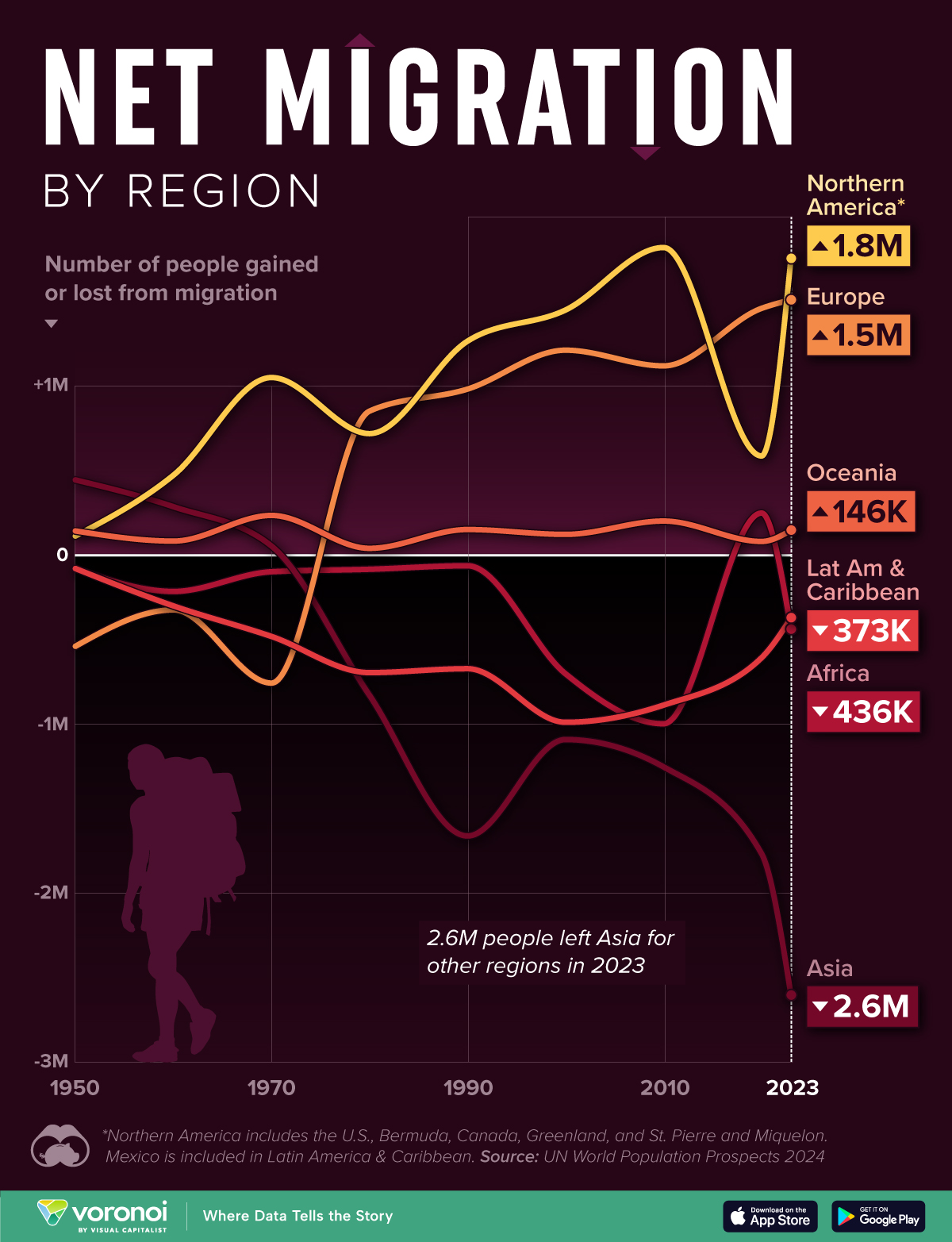 In den Regionen Nordamerika, Europa und Ozeanien wird zugewandert, während in Asien, Afrika und Lateinamerika abgewandert wird.