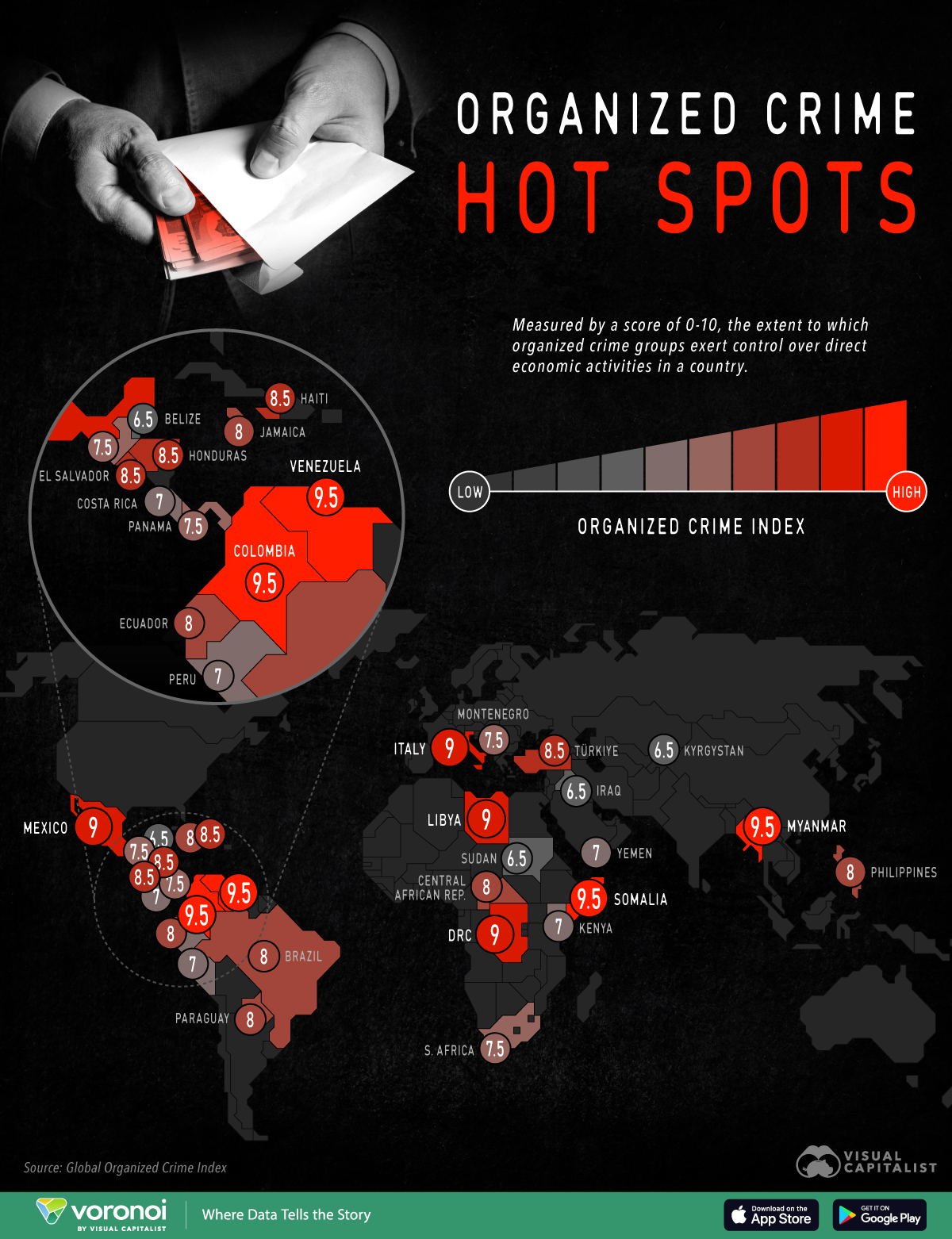 Der Global Organized Crime Index bewertet Länder von 0 bis 10 nach dem Einfluss krimineller Netzwerke auf wirtschaftliche Aktivitäten.