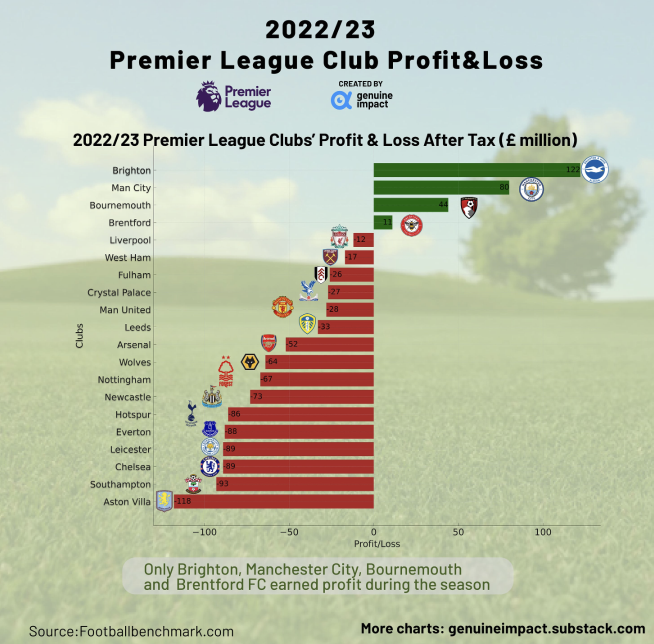 Die Premier League ist die umsatzstärkste Liga der Welt. In der Saison 2022/23 konnten von den 20 Vereinen nur Brighton, Man City, Bournemouth und Brentford einen Gewinn erwirtschaften.