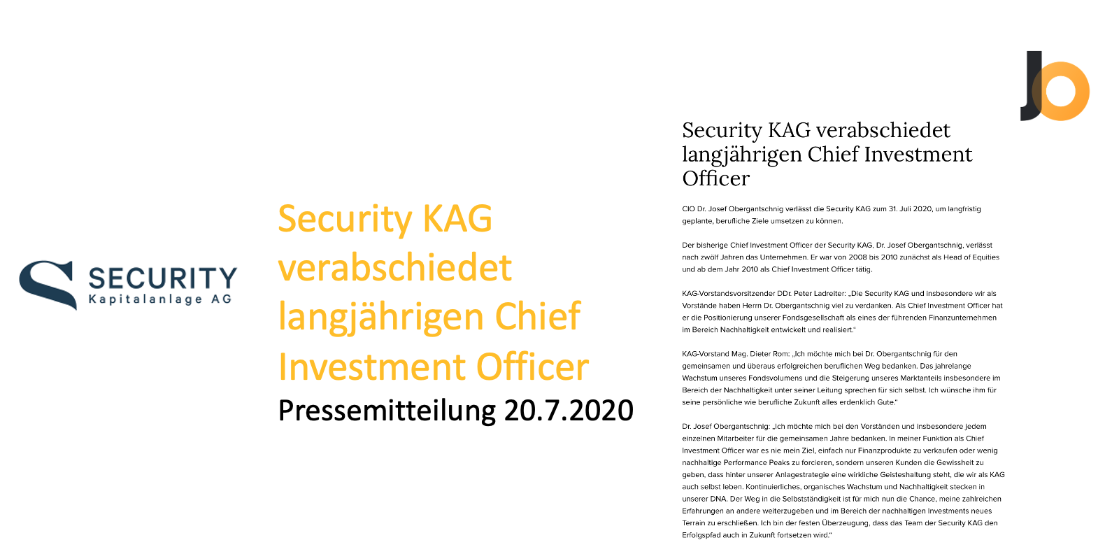Der bisherige Chief Investment Officer der Security KAG, Dr. Josef Obergantschnig, verlässt nach zwölf Jahren das Unternehmen. Er war von 2008 bis 2010 zunächst als Head of Equities und ab dem Jahr 2010 als Chief Investment Officer tätig.