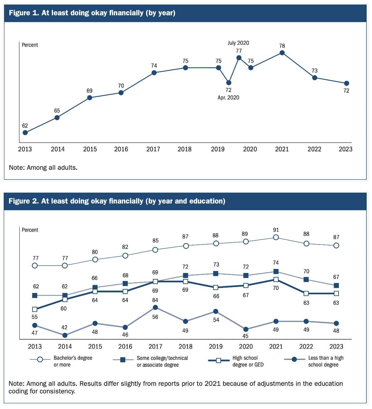 72% aller US-Bürger sind mit ihrer aktuellen finanziellen Situation zufrieden. Im Vergleich zu 2021 ist das deutlich zurückgegangen. Bei einer langfristigen Betrachtung liegt das Niveau aktuell jedoch im „höheren“ Bereich.
