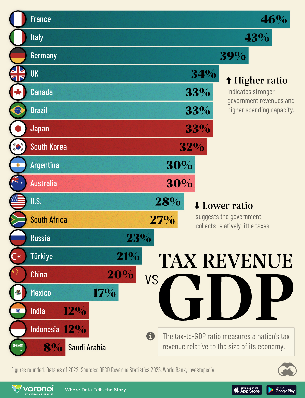 Weltweit betragen die Steuereinnahmen im Verhältnis zur Wirtschaftsleistung durchschnittlich 15%. Bei den G20-Ländern reicht die Spannweite von 46% in Frankreich bis zu nur 8% in Saudi-Arabien.