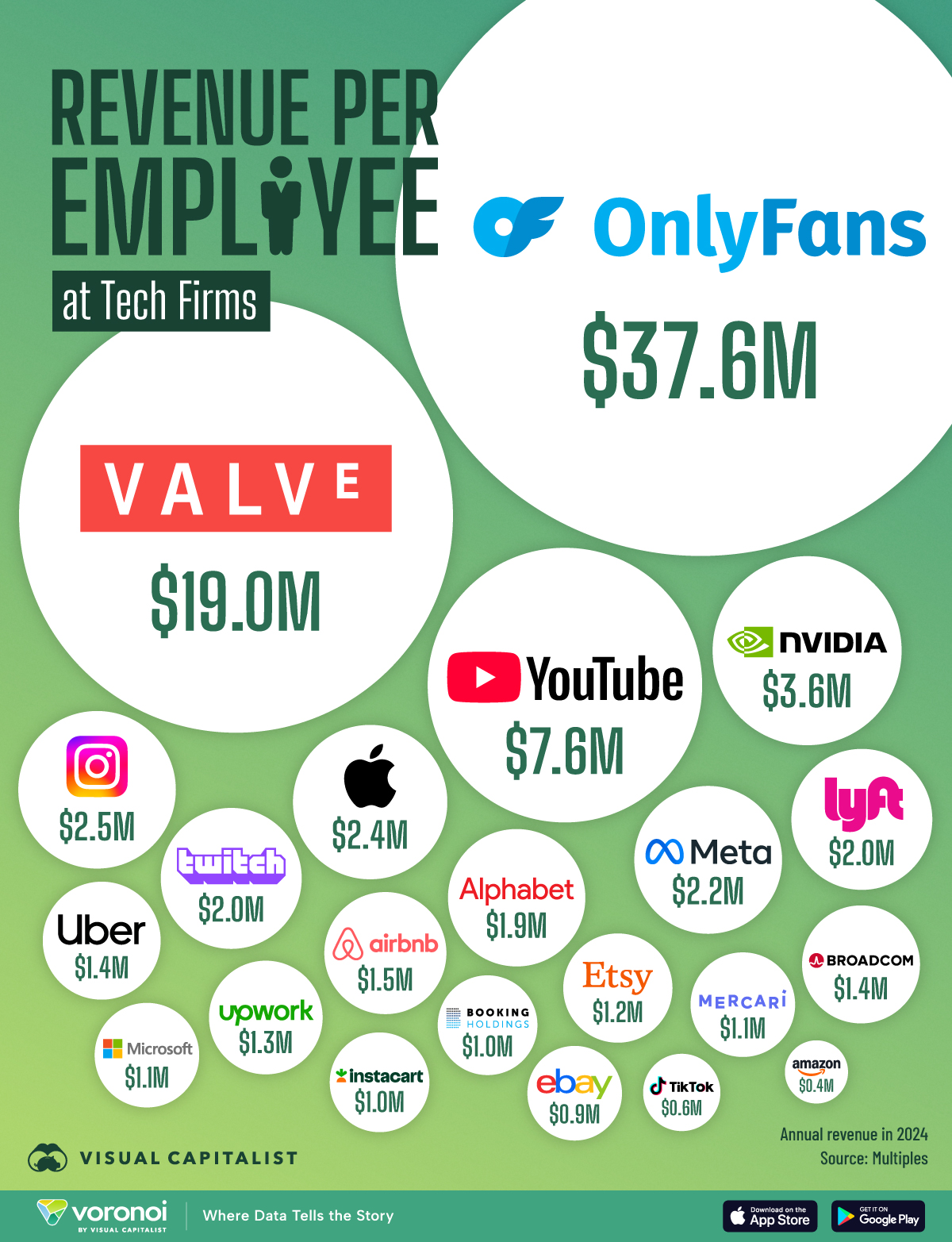 Letzte Woche stolperte ich über ein Chart, das fast schon Comedy-Charakter hat: OnlyFans – ja, das ist die britische Content-Plattform, auf der Creator exklusive Inhalte (von Fitness bis Erotik) direkt an zahlende Fans verkaufen – erwirtschaftet unglaubliche 37,6 Mio $ Umsatz pro Mitarbeiter. Valve (Gaming-Plattform Steam & legendäre Games wie „Half-Life“) liegt bei 19 Mio $, YouTube bringt es auf 7,6 Mio $. Und selbst Tech-Giganten wie Apple oder Meta schaffen „nur“ 2,4 bzw. 2,2 Mio. $ pro Kopf.