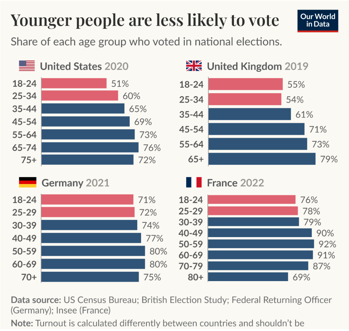 In den USA und Großbritannien gehen jüngere Menschen deutlich seltener zur Wahl als ältere Generationen. In Europa, beispielsweise in Deutschland und Frankreich, ist dieser Unterschied jedoch weniger ausgeprägt.