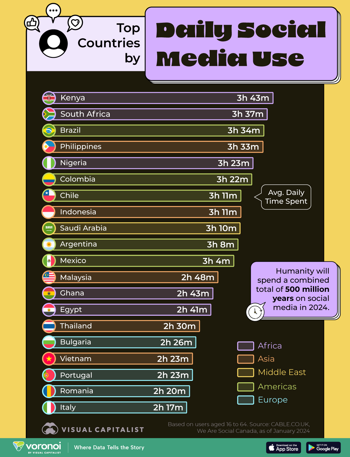 Top-Nutzerländer nach täglicher Social-Media-Zeit: