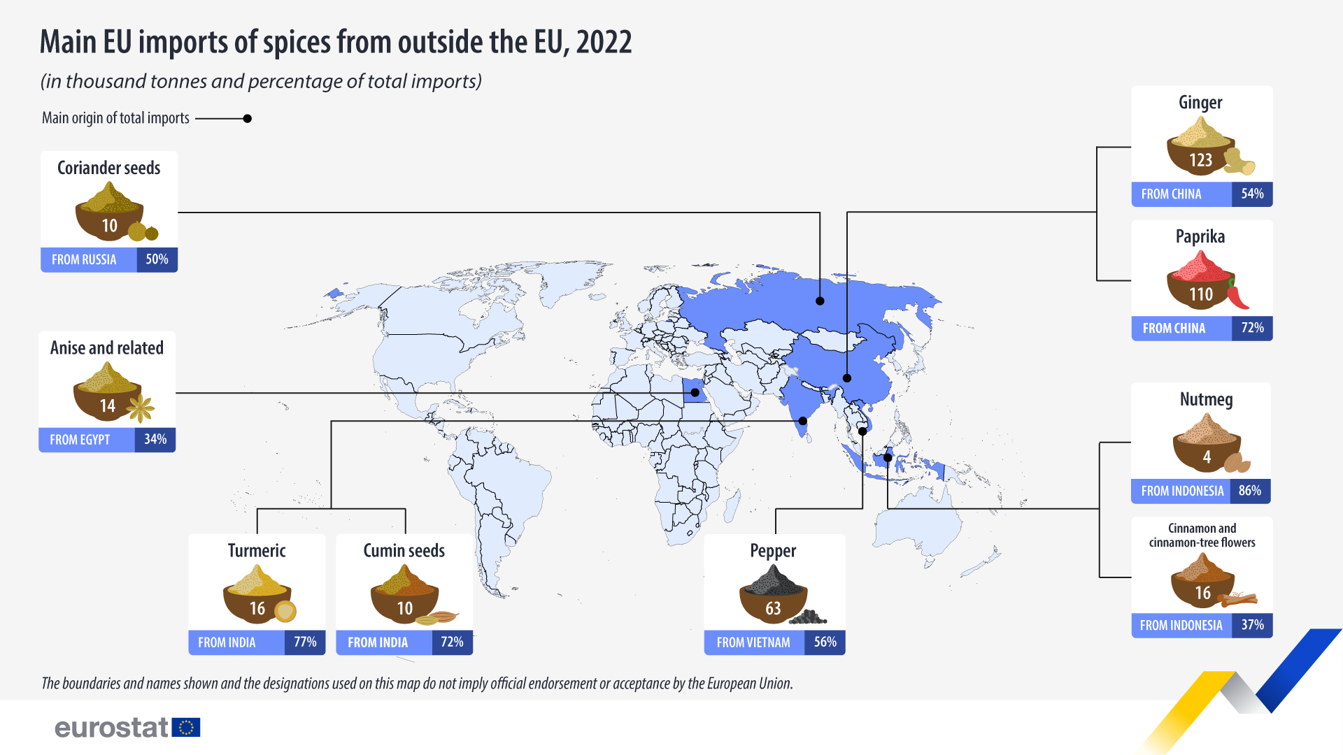 Die EU importiert jährlich 397.000 Tonnen Gewürze aus Nicht-EU-Ländern. Unser Hauptlieferant ist China , von wo 38% der EU-Gewürzimporte kommen. Auch Vietnam und Indien sind wichtige Quellen.